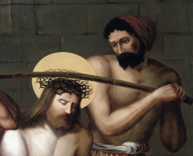 Le Christ est assis tandis que deux bourreaux lui place à l'aide d'un baton la couronne d'épines sur la tête. Cette représentation est à comprendre en relation avec le voile de sainte Véronique sculpté au sommet du retable.