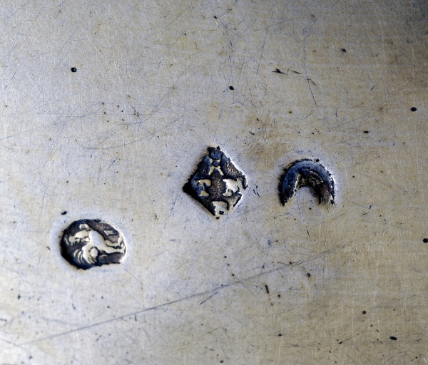 Poinçon de moyenne garantie sur la coupe, la fausse coupe et la patène. Poinçon de grosse garantie Paris 1798-1809 sur le pied. Poinçon de 1er titre Paris 1798-1809 sur le pied, la coupe, la fausse coupe et la patène. Poinçon d'association des orfèvres sur la fausse coupe et la patène. Poinçon de maître sur la fausse coupe, la coupe, la patène.