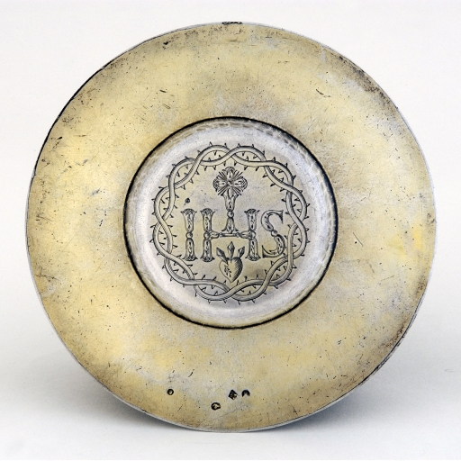 h = 28,5 ; d = 14,3 ; pds = 550. Dimensions de la patène : d = 15,3 ; pds = 180.