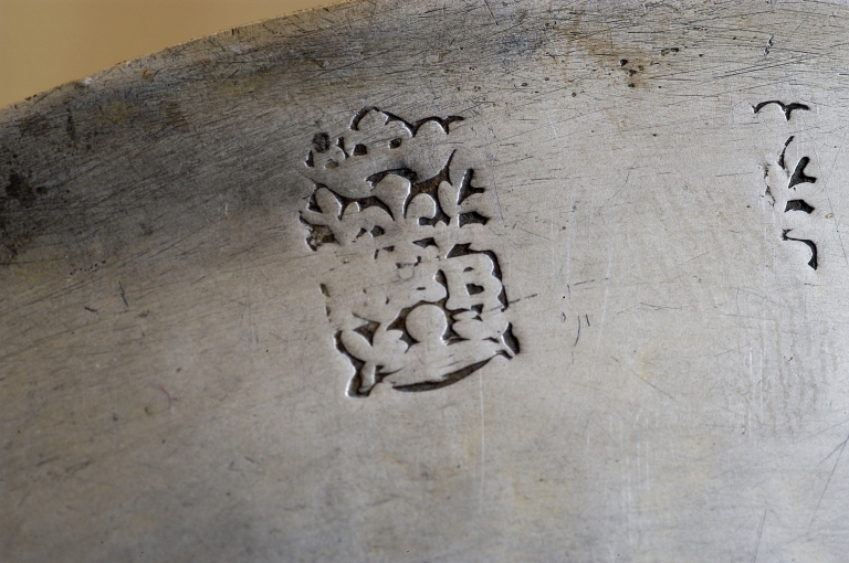 Poinçon de maître : poinçon de grande taille : R (?) et B séparés par deux rameaux entrecroisés, fleur de lys surmontée d'une couronne ouverte, en bas un grain de remède.