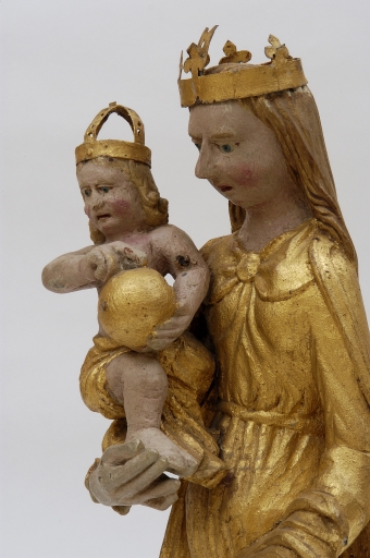 L'Enfant est rapporté. La Vierge fait bloc avec le socle à monstrance. Les couronnes sont en métal.