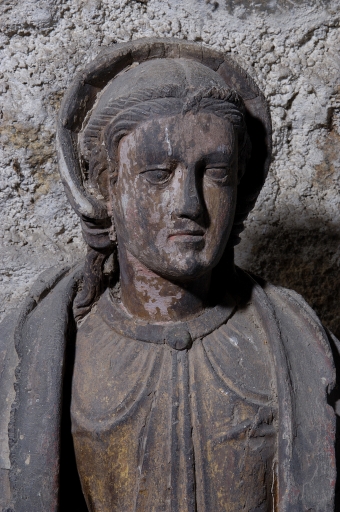 Mains et avant-bras droit disparus. Mauvais état de la polychromie. Présence de fentes.