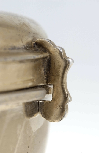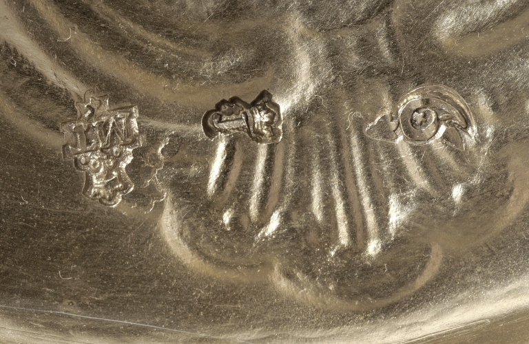 Poinçons (sous le pied) : initiales M et T, hermine en dessous, fleur de lys couronnée encadrée de deux points au dessus, maître Michel-Eloy Le Tailleur ; communauté de Rennes, 1758-1759 : lettre J, une hermine à gauche, couronne au dessus ; charge de Rennes, 1756-1762 : chiffre neuf fleuronné, une étoile dans l´oeil, une abeille au dessus ; décharge de Rennes, 1756-1762 : une petite tête de lévrier.