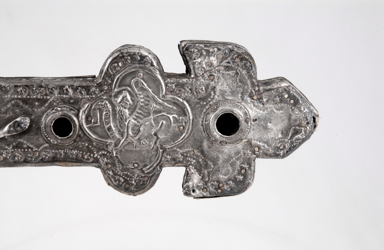 Cette croix est à rapprocher de deux autres semblables de forme et de décor, conservées, l´une à Campel, et l´autre à Montreuil-des-Landes, en Ille-et-Vilaine. Toutes trois présentent la même mise en oeuvre mixte de laiton argenté pour les bras, le noeud et la hampe, et d´argent uniquement pour les médaillons appliqués. Cette association si particulière, bien visible par la différence de couleur des parties en relief exposées à l´usure a dérouté les auteurs qui y voient tantôt des oeuvres en argent avec des traces de dorures, tantôt des oeuvres en étain. Si le décor d´une croix à l´autre présente quelques petites variantes, son exécution, essentiellement à base de molettes poinçonnées en relief et de lignes de pointillés poinçonnées en creux, est tout à fait caractéristique et se retrouve sur chacune d´elles. Des médaillons des évangélistes également identiques et surtout le médaillon de l´agneau divin, au revers, avec l´hermine et la fleur de lis, signent la production d´un même fabricant. Ce motif de l'agneau divin nimbé, la tête tournée vers l'étendard du Christ, emprunté aux monnaies royales du XIIIe siècle, dites à l´Agnus Dei, se retrouve fréquemment employé à partir du XIVe au revers des croix de procession.