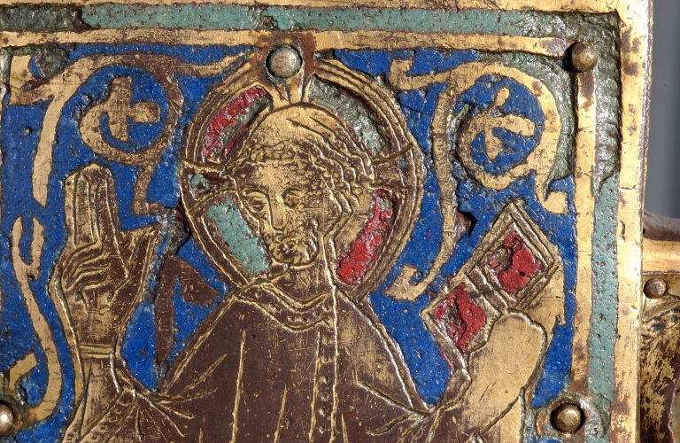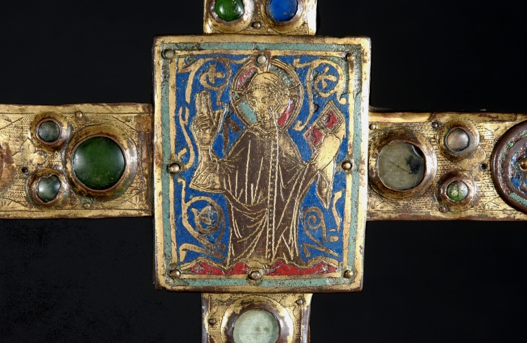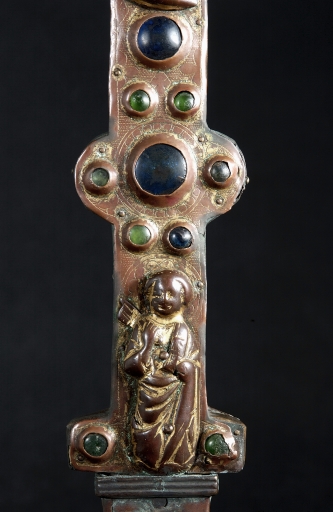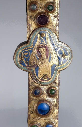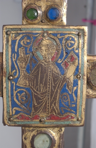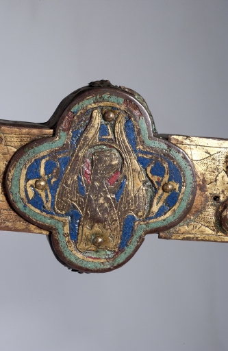 A la différence de la plupart des croix du limousin, la croix elle-même n´est pas ici en cuivre fondu mais en bois recouvert de plaques de cuivre gravées et dorées. Le décor est essentiellement obtenu à l´aide de cabochons de pâte de verre bleus et verts alternés. Ces pierres factices se détachent sur un fond mati gravé au tremblé et semé de petits motifs losangiques ou quadrilobés. La dorure des feuilles de cuivre, aujourd´hui très altérée sur la face antérieure de la croix devait contribuer pour beaucoup à l´effet de richesse de l´objet. Sur la face postérieure, les plaques émaillées selon la technique du champlevé présentent une gamme chromatique réduite : bleu intense de lapis lazuli pour les fonds, turquoise pour les bordures et rouge rubis pour les auréoles, les nuées et les attributs, gamme tout à fait caractéristique des dernières décennies du XIIIe siècle. Le parti de figures réservées en métal et non émaillées se détachant sur un fond de couleur est également typique de cette époque, de même que les rinceaux un peu raides également traités en réserve. La gravure des figures du tetramorphe et du Christ, de grande qualité, associe trois techniques, le trait continu pour les plis et les traits courts, le trait au tremblé pour les contours et le trait au pointillé pour les parties tournantes du dessin. Le Christ en croix est très semblable à celui de la croix d´Argentat, datée de la deuxième moitié du XIIIe siècle ; une reprise en ciselure visible dans les cheveux, la barbe, la couronne et le torse, contribue avec l´ensemble du décor à distinguer cette croix de la production courante de cette époque.