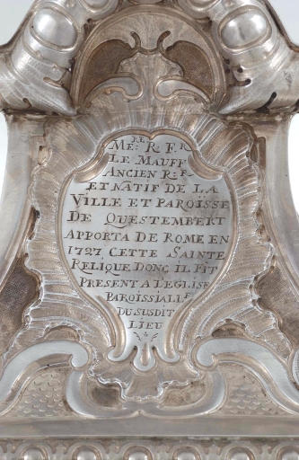 Poinçons (sous le pied) : initiales J et D séparées par une hermine avec une fleur de lys couronnée en chef entre deux grains de remède. Communauté de Rennes de 1756 à 1762 : lettre G couronnée ; charge de Rennes : 9 couronné une hermine dans l'oeil. Inscription (gravée dans un cartouche sur la face postérieure du pied) : MRE R. F. LE MAUFF ANCIEN RR ET NATIF DE LA VILLE ET PAROISSE DE QUESTEMBERT APPORTE DE ROME EN 1727 CETTE SAINTE RELIQUE DONT IL FIT PRESENT A L'EGLISE DUDIT LIEU. Poinçons (sous le pied).