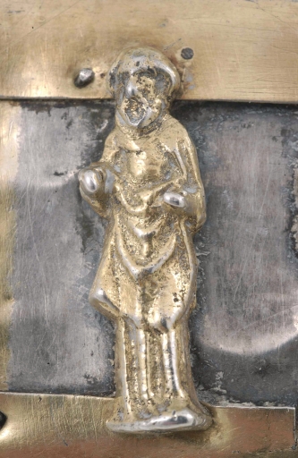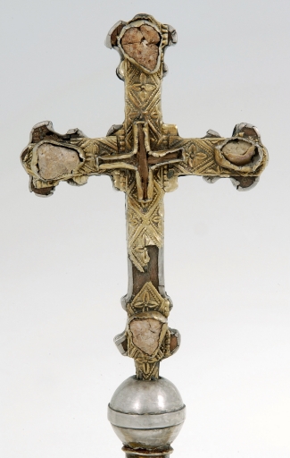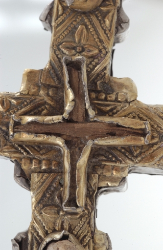 La croix a été remontéee sur le sommet de la châsse à la fin du 19e siècle : la sphère intermédaire date de cette époque ; plusieurs manques dans les feuilles d'argent estampé qui garnissent la croix.