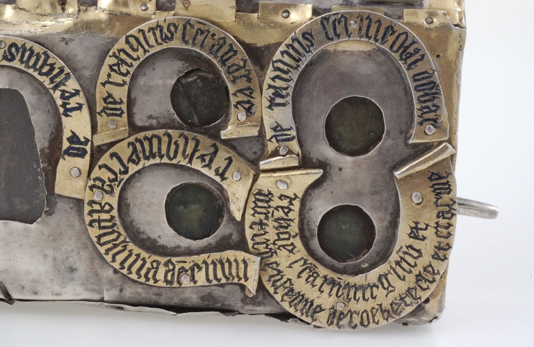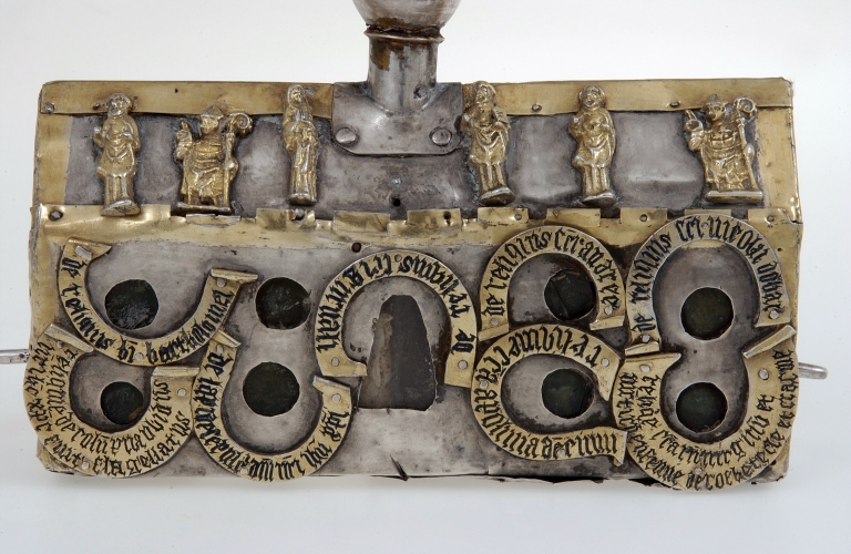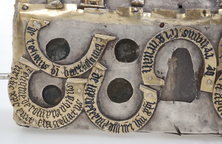 Inscriptions dans chacun des huit phylactères : DE RELIQUIS BEATI BARTHOLOMEI ; DE RELIQUIS S (ANCT) I GURVALI ; DE RELIQUIS S (ANCT) I ANDREE ; DE RELIQUIS S (ANCT) I NICOLAI DE BAR (I) ; RELIQUIE DE COLOMNA UBI DOMINUS NOSTER HESUS CHRISTUS FUIT FLAGELLATUS ; DE LAPIDE SEPULCHRI DOMINI NOSTRI JESU XRI ; RELIQUIE SANCTA APOLINIA ; DE MM RELIQUIE SANCTARUM VIRGINUM ET MARTIRUM EUFEMIE DEROTHE TECLE ET C (A) TARINE.