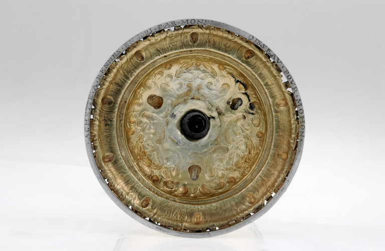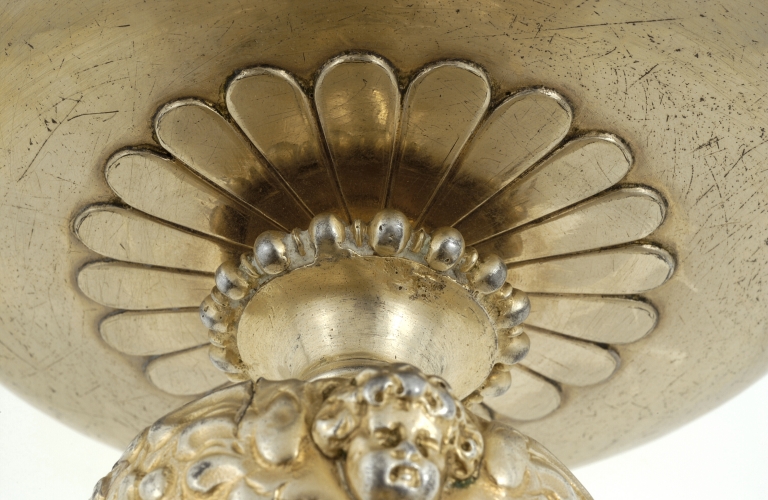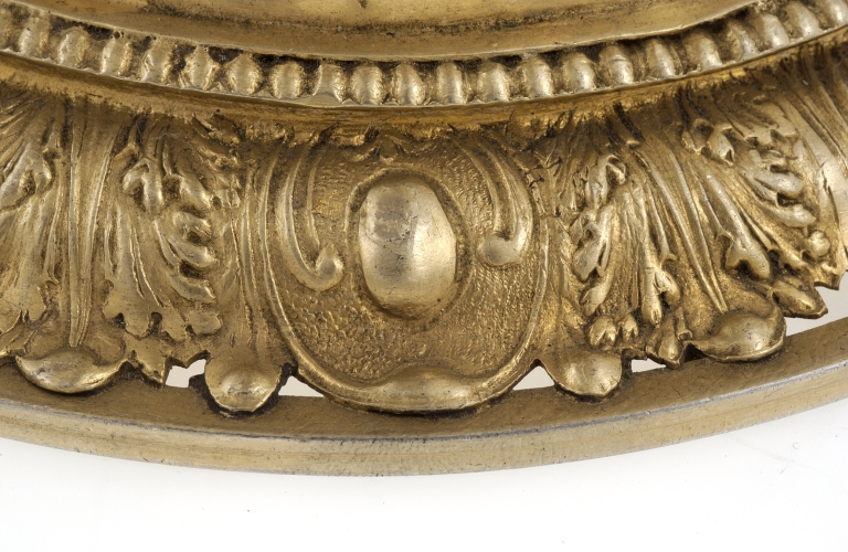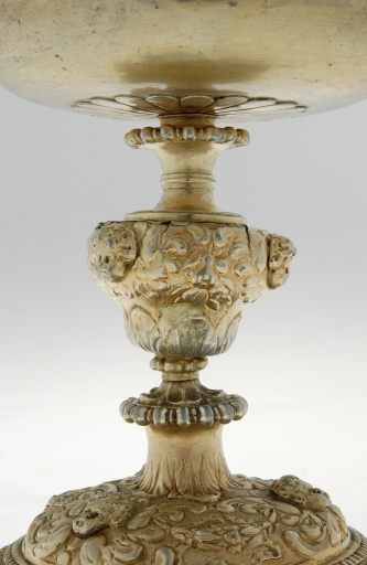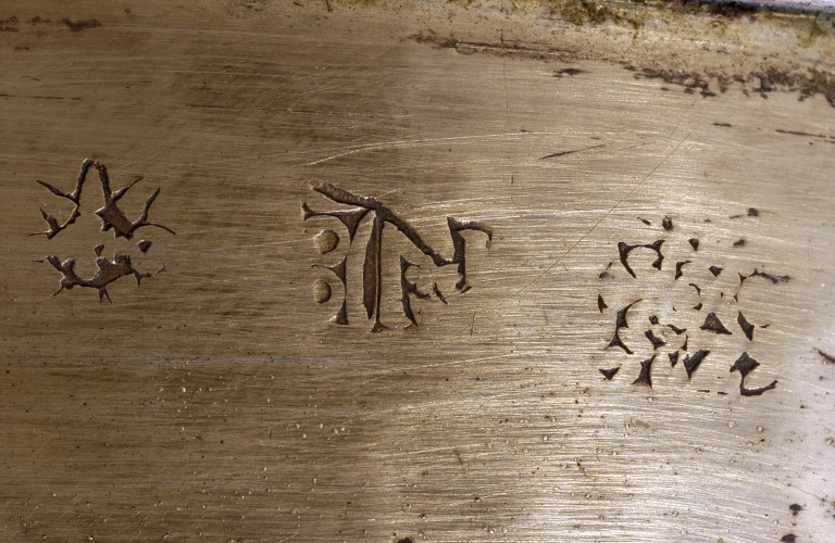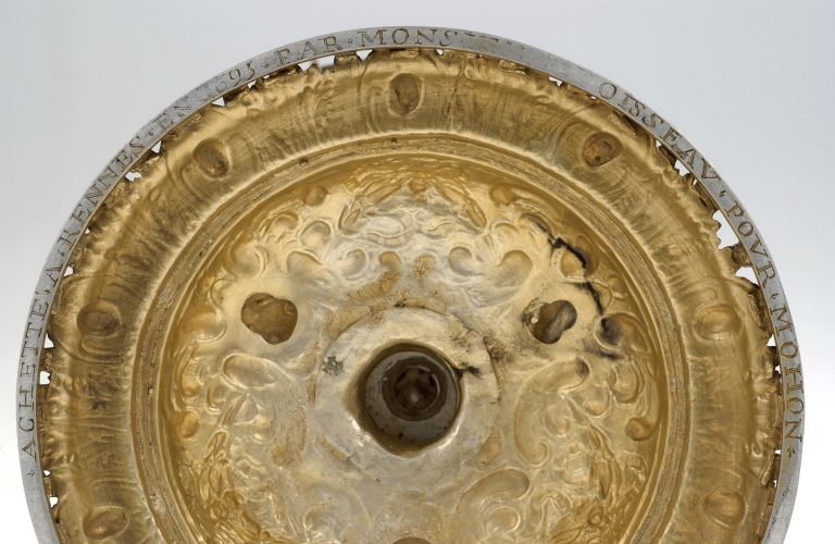 Poinçons (sur la coupe) : initiales N et B séparées par deux palmes entrecroisées, un point au dessous, une fleur de lys couronnée au dessus, maître Nicolas Boullemer ; lettre Z couronnée, chargée d'une hermine, communauté de Rennes 1694-1697. Inscription (gravée sous la bate du pied) : ACHETE A RENNES EN 1695 PAR MONSIEUR DOISSEAU POUR MOHON.