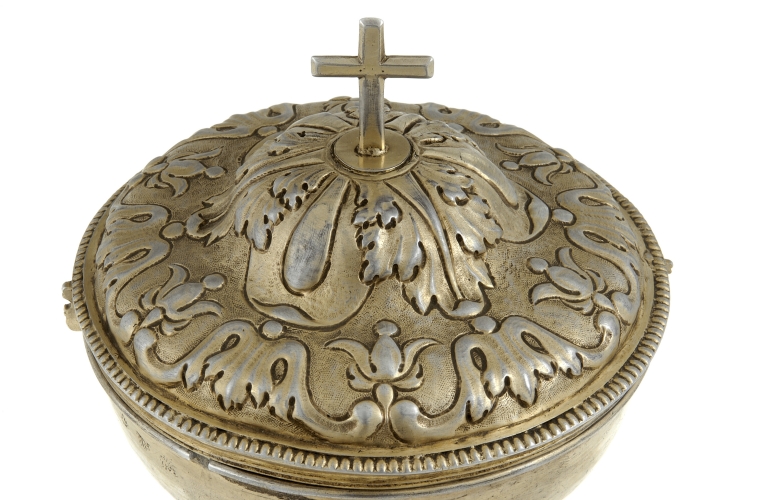 Ce ciboire est un bel exemple de l´évolution du modèle « riche » à la fin du XVIIe siècle. La bordure du pied, en doucine, plus large que sur les modèles antérieurs, est ornée d´un décor estampé, à feuillages et oves plus varié et surtout moins ajouré, en fait plus fourni. Sur le dessus du pied, les têtes d´angelots n´alternent plus avec les emblèmes de la Passion mais avec de fines guirlandes de laurier d´un style parfaitement Louis XIV. Le noeud demeure conforme aux standards du milieu du siècle. Par contre le couvercle reprend en son centre l´alternance de feuilles lisses et nervurées de la bordure du pied, rehaussé sur son bord d´une couronne en lambrequin qui sature la surface et seule la coupe est unie. L´alliance des deux techniques principales de l´orfèvrerie ancienne, le repoussé, exécuté par l´envers de la pièce et le ciselé par l´extérieur, est ici particulièrement heureuse. L´ensemble du décor est cerné de traits profonds ciselés au traçoir qui mettent en valeur la vigueur du dessin, puis repris au mat pour lui conférer davantage de modelé. Outre cette qualité du décor et la sûreté du trait, des détails signent une exécution particulièrement soignée, par exemple le raccord entre la coupe et la tige, en cul de lampe à godrons plats. L´inscription gravée sous la bâte du pied, qui précise et la date de l´achat et le nom du recteur, reconnaissable à l´appellation de Monsieur, confirme une fois de plus l´important investissement que représente alors cette pièce d´orfèvrerie pour une paroisse. Bien qu´il ne soit que partiellement insculpé, le poinçon d´orfèvre est parfaitement identifiable avec celui de Nicolas Boullemer, maître rennais, dont les oeuvres conservées, relativement peu nombreuses, sont toujours de qualité. Le calice de Surzur, réalisé par le même maître en 1697, présente un égal niveau de qualité.