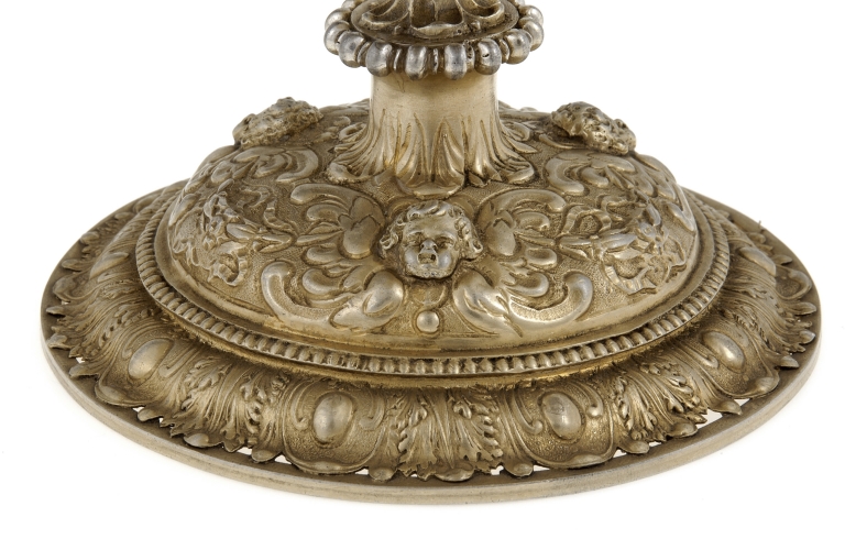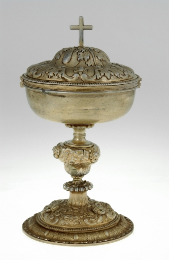 Ciboire de modèle riche : pied à large bordure estampée de feuillages, orné de têtes d'angelots et de guirlandes de laurier. Noeud piriforme à têtes d'angelots, couvercle cicelé de larges feuillages.