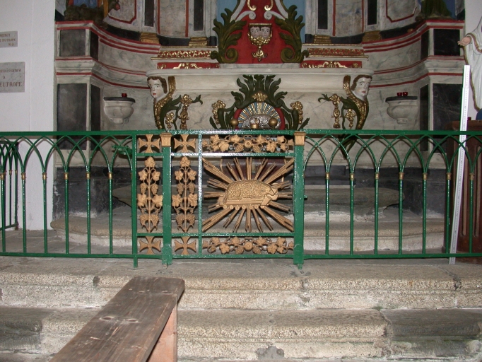 Sur les battants s'ouvrant sur le choeur, les lettres "A. M." sont placées au sein d'une couronne dans une gloire ; de part et d'autre de ces battants, les panneaux latéraux présentent le Bon Pasteur. L'agneau mystique est figuré sur le portillon de la chapelle nord.