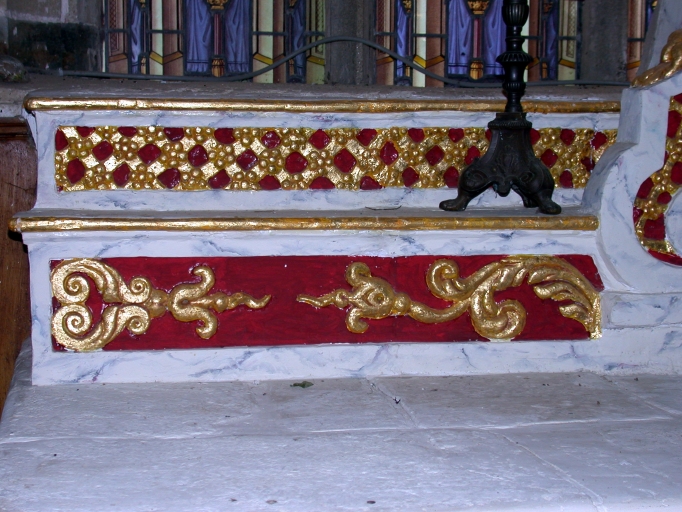 Autel galbé en calcaire dont la base est en bois ; médaillon sculpté au centre, décor en haut-relief aux angles ; deux gradins en calcaire à décor en bas-relief ; tabernacle de calcaire à décor en bas-relief dont le battant est en bois à décor en bas-relief peint doré.