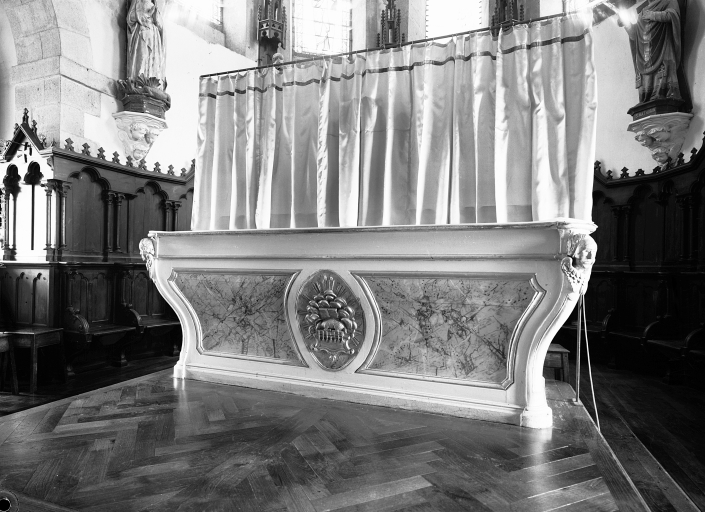Autel en forme de tombeau galbé orné à chaque angle d'une tête d'angelot ailé sculptée en haut relief et décoré sur sa face principale de l'Agneau mystique en bas relief.