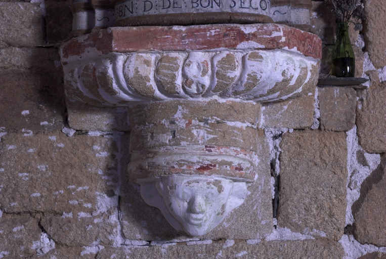 Groupe sculpté de la Vierge à l'Enfant, en bois polychrome, reposant sur un socle en granite historié représentant une tête d'homme. La main droite et le bras droit de l'Enfant sont des éléments rapportés. Revers non étudié.