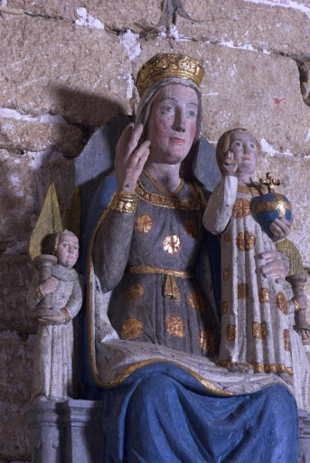 La Vierge, couronnée, est assise sur un trône et tient de sa main gauche l'Enfant, debout sur ses genoux. Celui-ci porte un globe surmonté d'une croix dans la main gauche et fait un geste de bénédiction de la main droite. De part et d'autre, deux anges porte-cierge complètent le groupe.