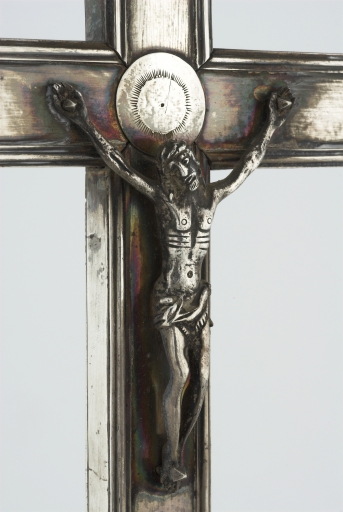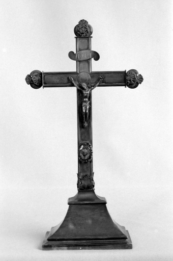 Croix-reliquaire constituée à la fois d'un pied uni purement néo-classique et de fleurons rocaille. Christ fondu et rapporté. Plaque de cuivre maintenue par quatre rivets gravée sous le pied.