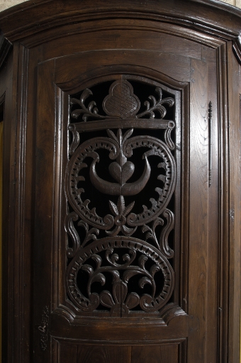 Confessionnal composé de trois loges surmontées d'une corniche galbée, celle du centre est fermée par un battant à claire-voie ; fiches à lacets en fer forgé.