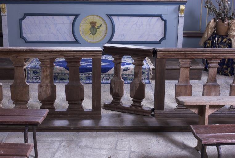 Clôture de choeur composée d'une série de balustres plats, à pied et col moulurés, s'ouvrant à l'aide d'un battant central.