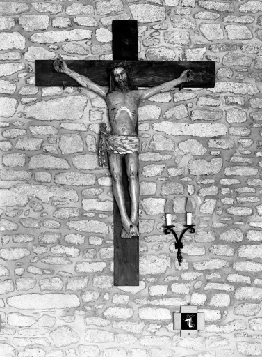 Christ en croix vêtu d'un périzonium court à large pan tombant sur le côté droit. Ses jambes, légèrement pliées, se terminent par des pieds croisés en rotation interne.