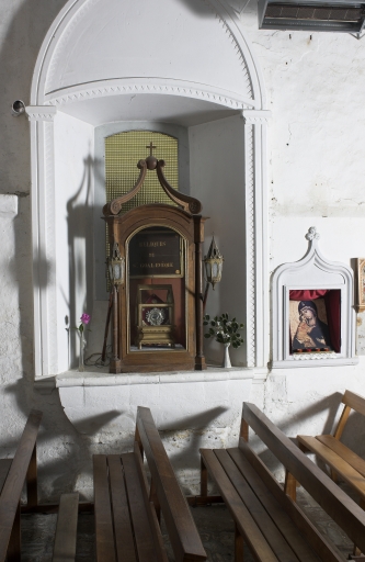 Les reliques sont conservées dans une lunule en argent ornée d'une garniture en laiton doré. Le reliquaire est recouvert de velours rouge avec application sur textile. La chasse qui contient les reliques est en bois doré, vitré, à battant, de plan rectangulaire à élévation galbée portée par quatre pieds.