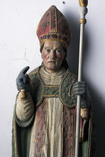 Saint Goal tenant la crosse abbariale dans la main gauche, bénissant de la main droite.