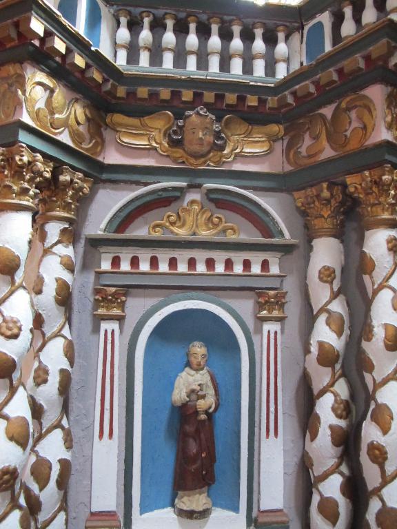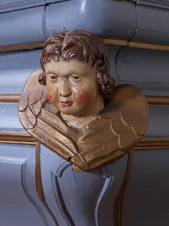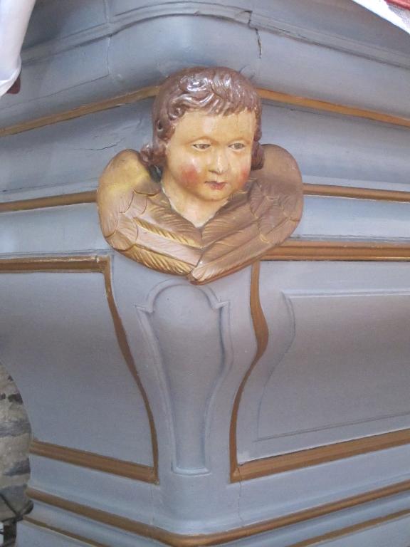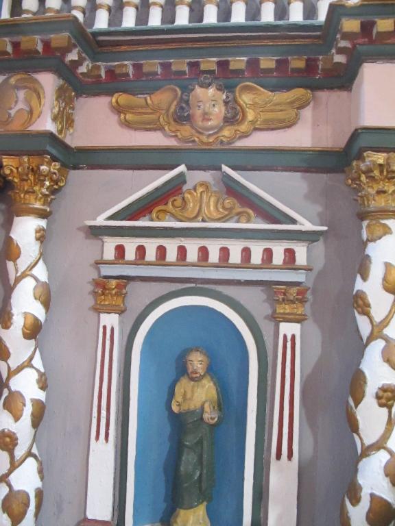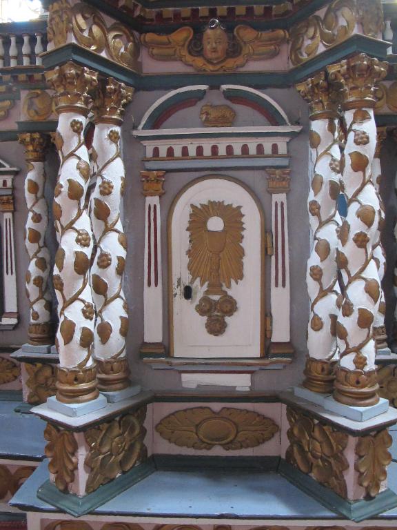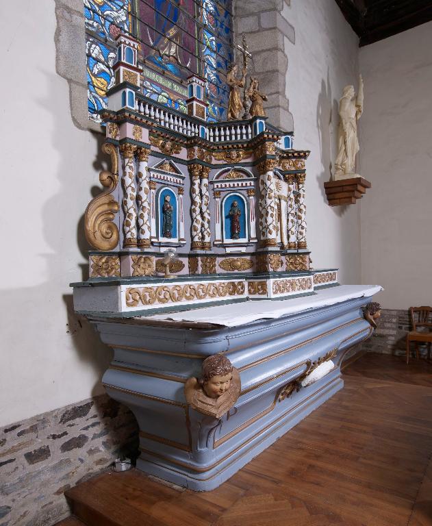 L’ensemble du maître-autel, du 18e siècle, rassemble des œuvres de plusieurs provenances ; l’autel-tombeau à élévation galbée porte en son centre un Agneau aux sept sceaux et, dans les angles, deux angelots, de bonne facture, que l’on peut associer aux deux petits anges qui encadrent la croix d'autel du 19e siècle posée sur le tabernacle. Ce dernier est sans rapport avec l’autel - aussi bien dans ses dimensions que dans sa réalisation plus frustre - comme le montre une photographie où il est supporté par le vestige d’autel déposé aujourd’hui dans la chapelle des fonts baptismaux. Les ailes du tabernacle sont occupées par des niches architecturées, séparées entre elles et d'avec le tabernacle par deux colonnettes torses où s’accrochent des rinceaux de vigne ; la frise supérieure, rythmée d’angelots, est surmontée d’une rangée de petits balustres ; chaque niche abrite une figurine ; à gauche : saint Pierre et saint Paul ; à droite : saint Jean et un apôtre non identifié.