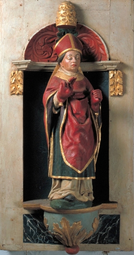 La statue de saint évêque de la fin du 15e siècle repose dans une niche plus récente du 17e siècle dont la statue d'origine a disparu. La tiare qui somme le fronton devait couronner cette statue.