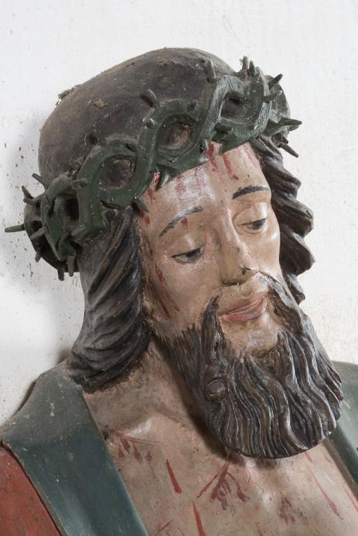La couronne d’épines enfoncée sur sa tête lui provoque des blessures sur le front qui saignent. Ses cheveux sont bouclés et sont tournés vers l’arrière comme pour dégager son visage. Ses yeux sont presque fermés, il regarde vers le sol. Sa bouche est légèrement entrouverte.