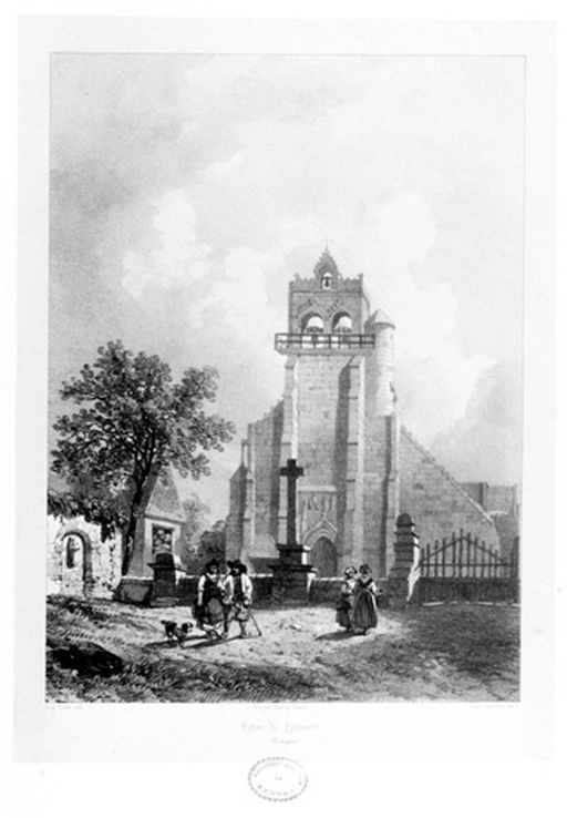 Plounévez-Moëdec, le bourg : église paroissiale Saint-Pierre, dessin représentant l'église de Plounévez-Moëdec au milieu du 19e siècle tiré des Voyages pittoresques et romantiques dans l'ancienne FranceImmatriculation