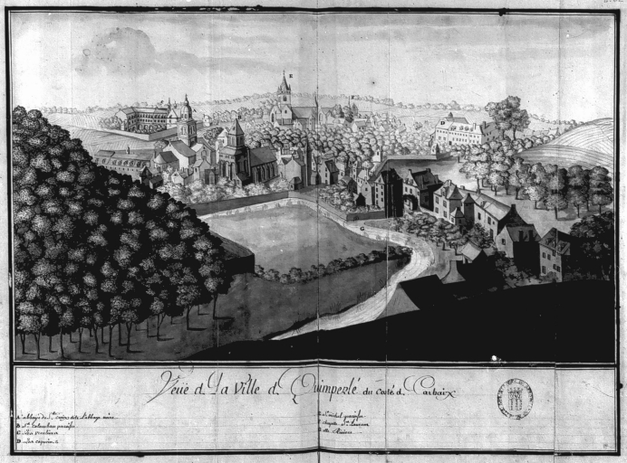 Vue cavalière de la ville par C.-P. de Robien, vers 1737 (B.M. Rennes)Immatriculation