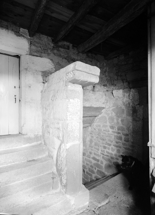 Vue de la pierre sculptée au haut du mur d'échiffre de l'escalierImmatriculation