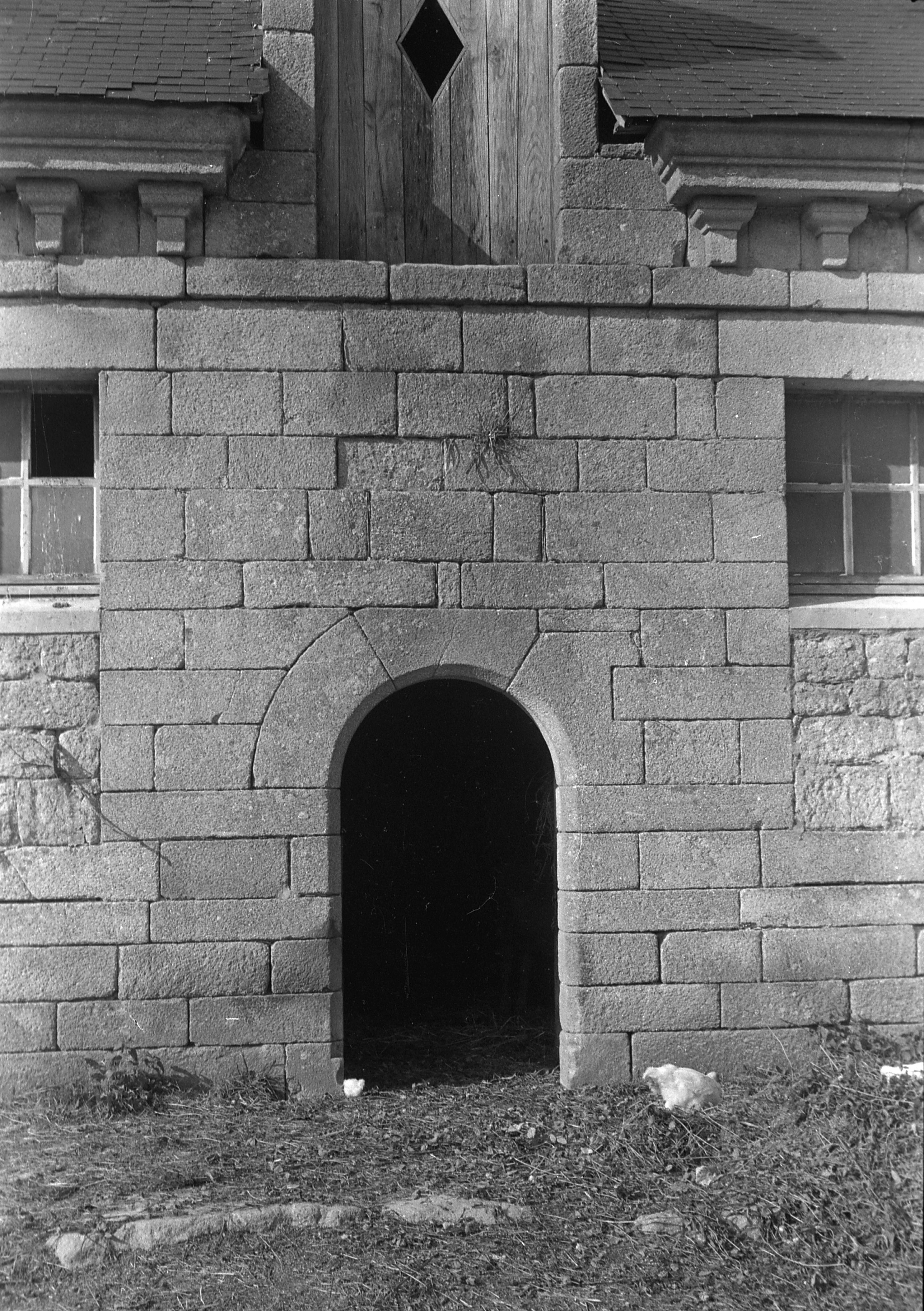 Vue des communs : élévation sud, porte centrale en arc plein cintre mouluré (état en 1965). Elle est surmontée d'une lucarne permettant le stockage des récoltesImmatriculation
