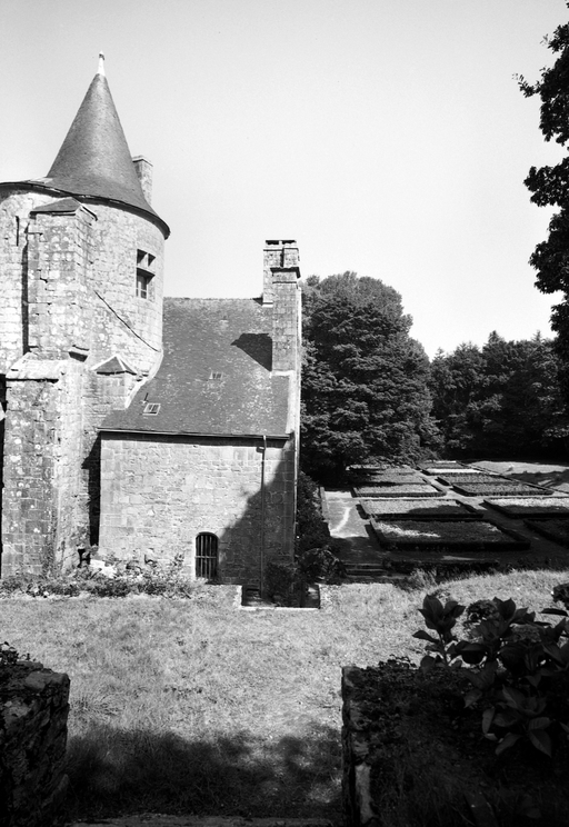 Logis, élévation postérieure : détail de la tour d'escalier et du jardin de buis.Immatriculation
