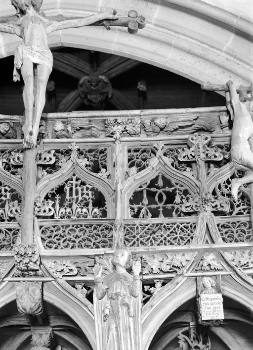 Jubé - Face ouest, la galerie, garde-corps entre le Christ et la mauvais Larron, et détail de la main courante.Immatriculation