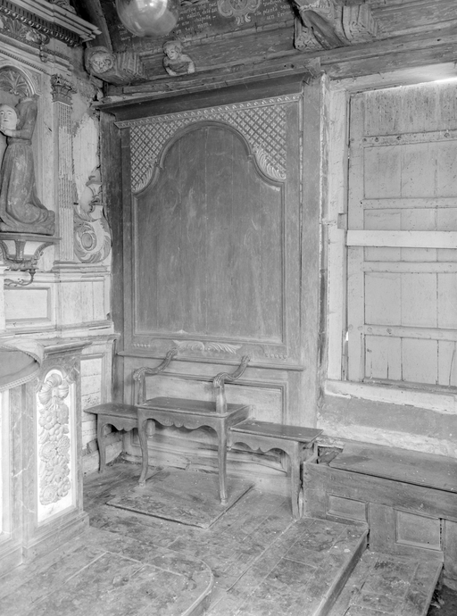 Lambris, sièges et sablières du mur sud.Immatriculation
