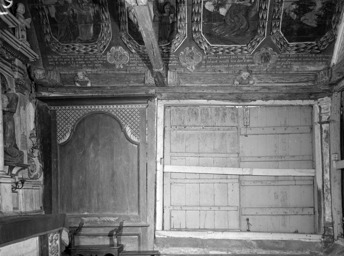 Vue d'ensemble du mur sud, lambris, sablière et voûte peinte.Immatriculation