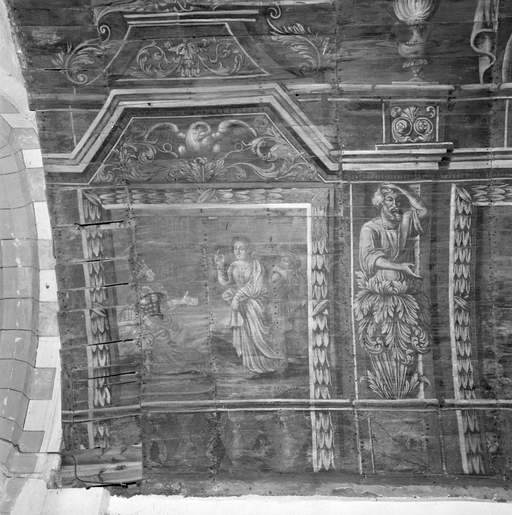 Voûte lambrissée peinte, nef, panneau IV au nord-ouest, sainte Noyale et le tyran Nizan.Immatriculation