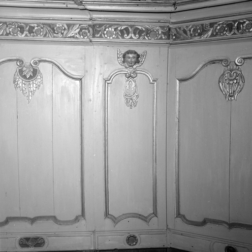 Lambris du choeur, détail des panneaux de l'angle sud-est.Immatriculation