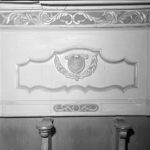 Lambris du choeur, détail d'un panneau sous la fenêtre nord.Immatriculation