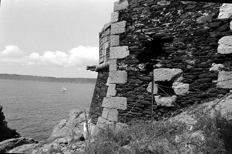 Vue de la batterie de Cornouaille en 1967 : extrémité ouest, escarpe, chaînes harpées en pierres de taille de graniteImmatriculation