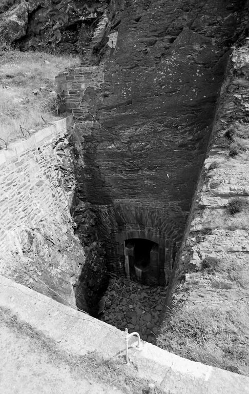 Vue de la batterie de Cornouaille en 1967 : entaille ménagée dans le terre-plein de la batterie pour dégager le champ de tir de l'embrasure de droite de la batterie de ruptureImmatriculation