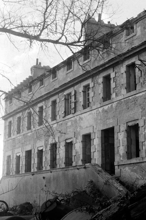 Vue du grand bâtiment : élévation orientale (état en 1967). Un double escalier dessert le rez-de-chaussée surélevéImmatriculation