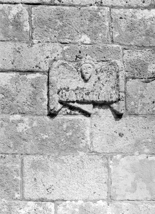 Pierre sculptée du mur est du croisillon sud (ange portant une inscription), état en 1971Immatriculation