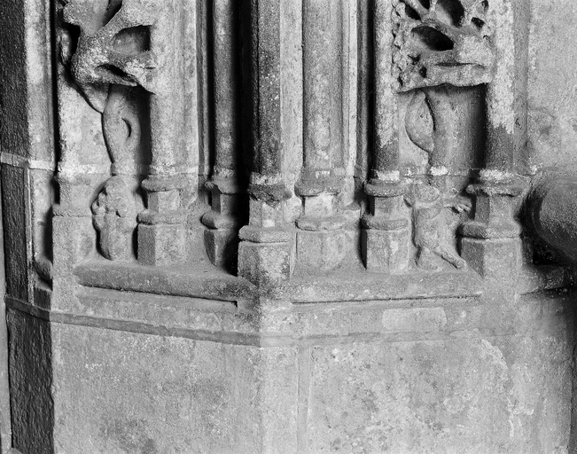 Base du décor de la porte nord du porche de la nef, deux petits personnages.Immatriculation