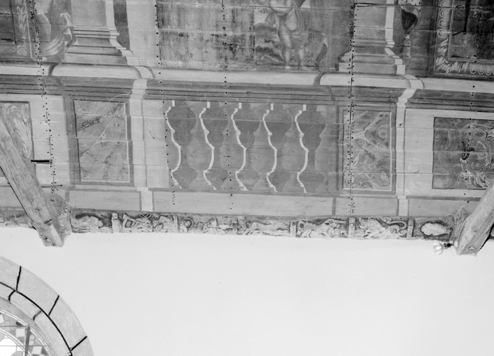 Mur sud de la nef, âne jouant de la cornemuse et homme jouant de la bombardeImmatriculation