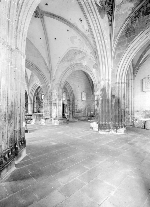 Trois piliers de la croisée du transept. Au premier plan à gauche, le pilier sud-est, puis les piliers nord-est et nord-ouest. Arrière plan, le bras nord du transept et le bas-côté nord.Immatriculation