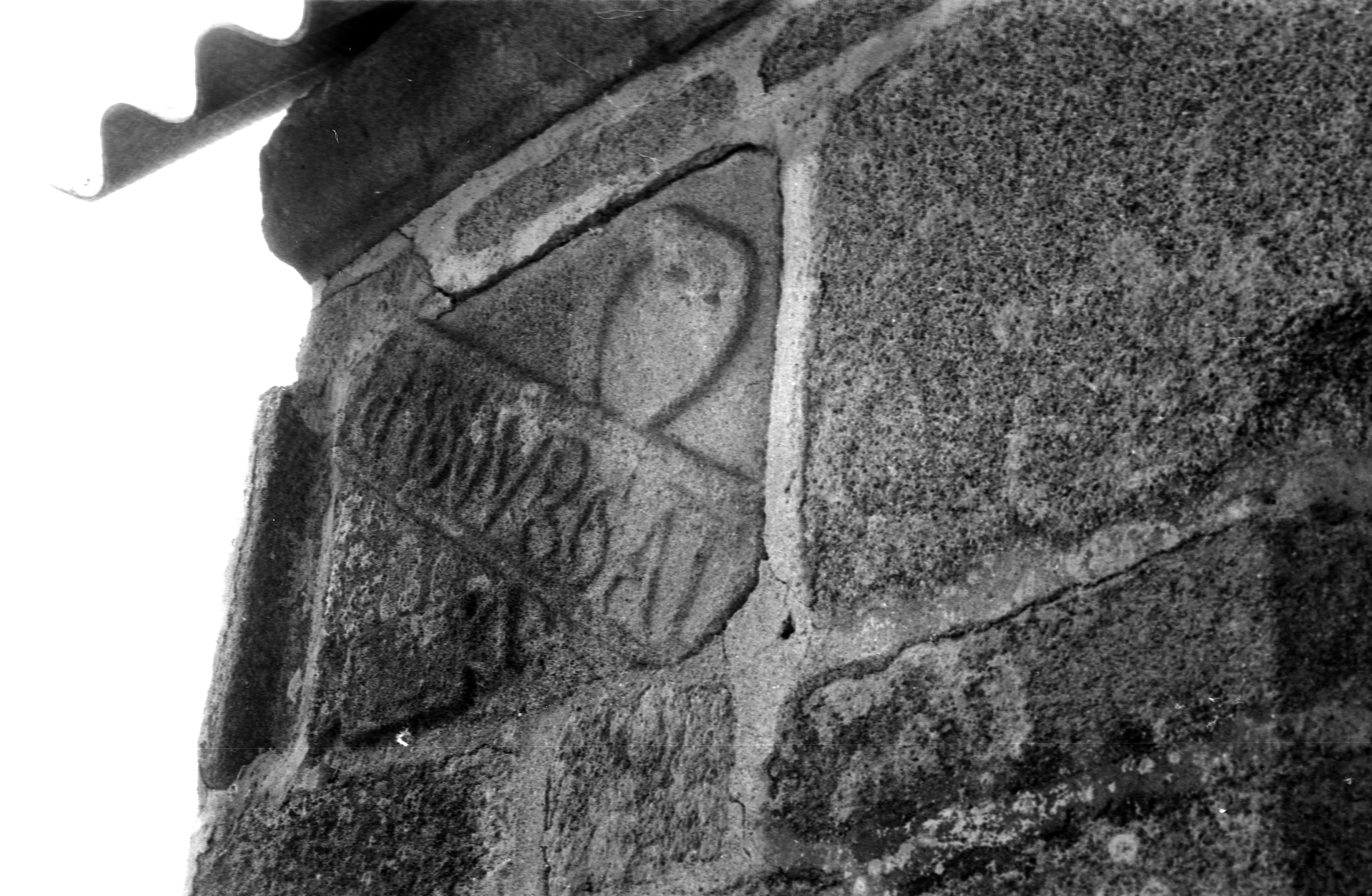 Elévation sud, détail de la pierre portant le nom du prêtre, à gauche de la porte, état en 1967Immatriculation