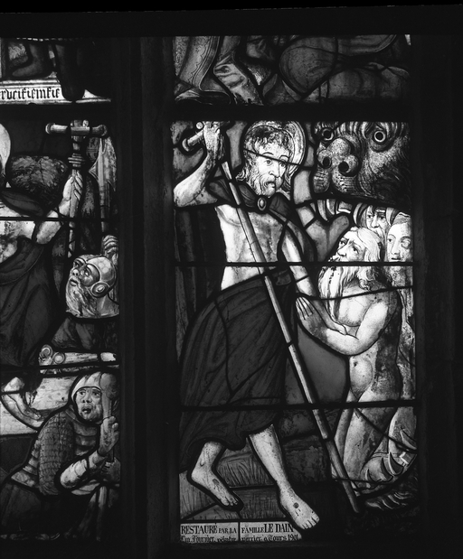 Vitrail de la Passion, dans le bras sud du transept : panneau 9, la Descente aux LimbesImmatriculation