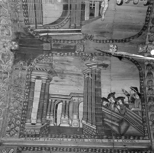 Lambris peint de la voûte, choeur, au sud : panneau 14, Rivalon rebâtit l'abbayeImmatriculation